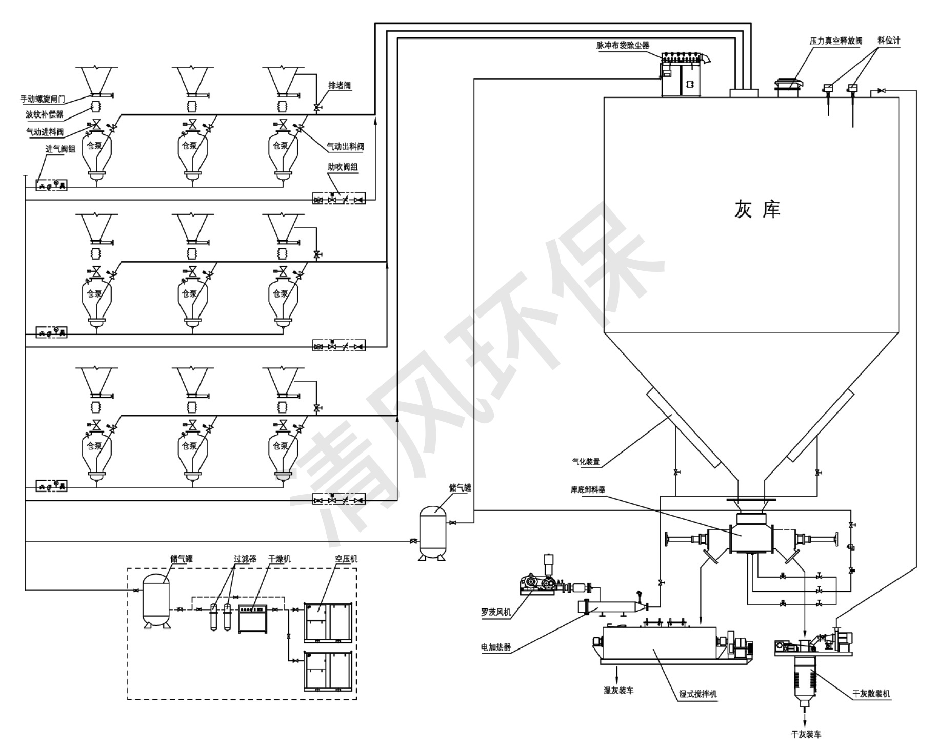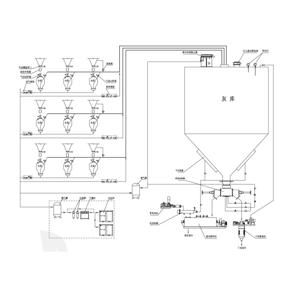 本系统中,单台仓泵组成一个输送单元,由压缩空气将粉煤灰通过管道输送至灰库。该系统主要用于电除尘器灰斗。