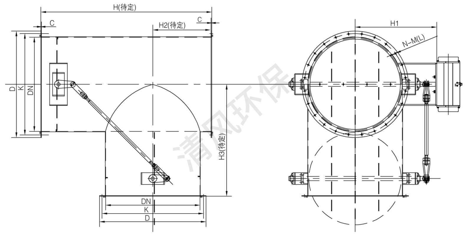 风阀为门板结构,当风阀关闭时,门板与挡条密闭,以达到有效隔绝前后介质的目的。挡板的启闭由手动装置(或电动、气动执行器)通过连杆机构来执行,连杆机构为球关节,确保转动无空行程。电动或气动执行器设有开关定位连锁装置及外接行程开关,保证动作的可靠和有效预防误操作。