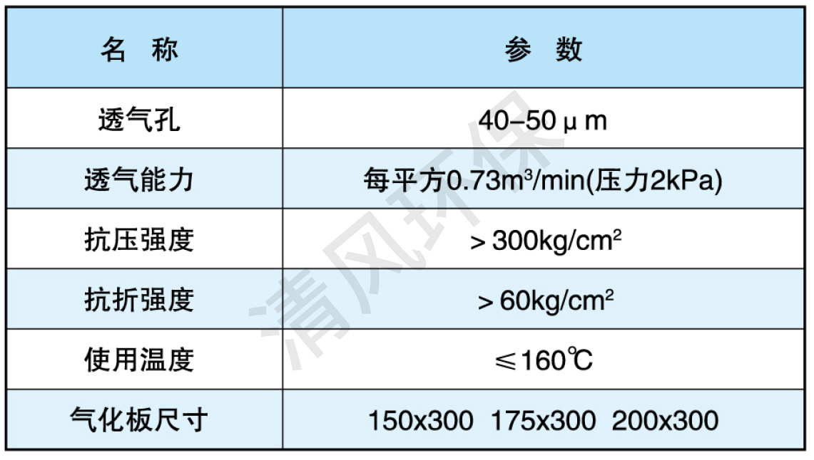 本装置设置于物料贮存库底底部,卸料时,接通经过净化和加热后的压缩空气,使物料流态化,增加物料流动性,使卸料通畅。本装置气化板是碳化硅颗粒烧结成形,具有良好的透气性呵耐磨性,槽体内表面采用酸洗镀锌,抗氧化不易生锈工艺,气化板与槽体之间采用耐高温橡胶树脂密封。