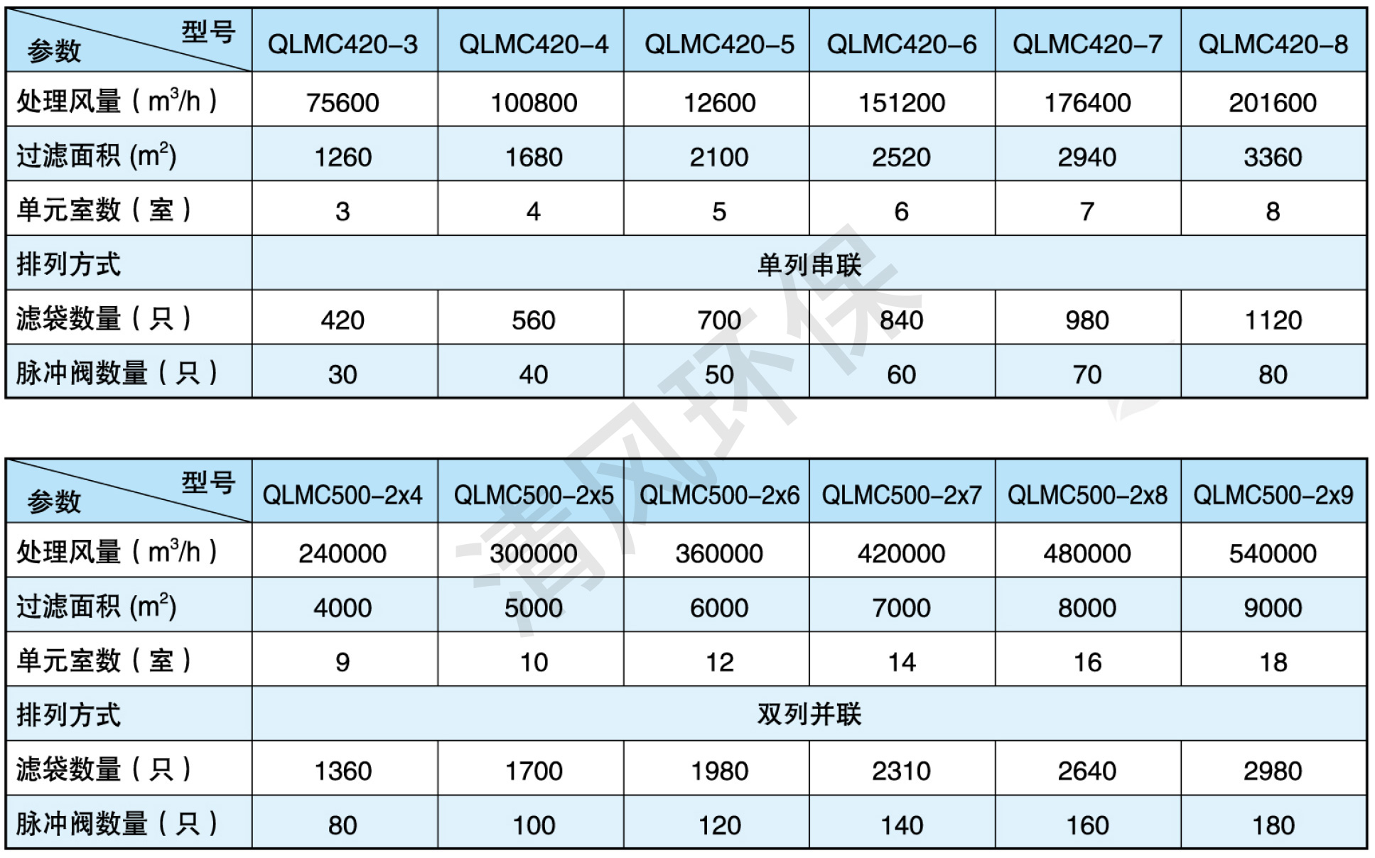 QLMC型脉冲除尘器性能参数表